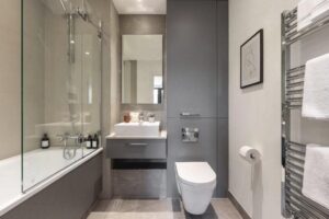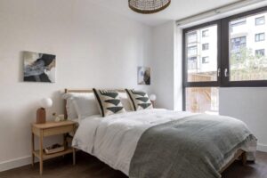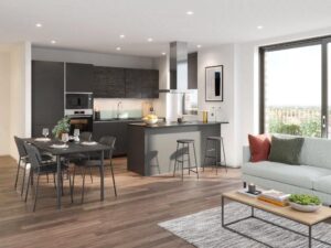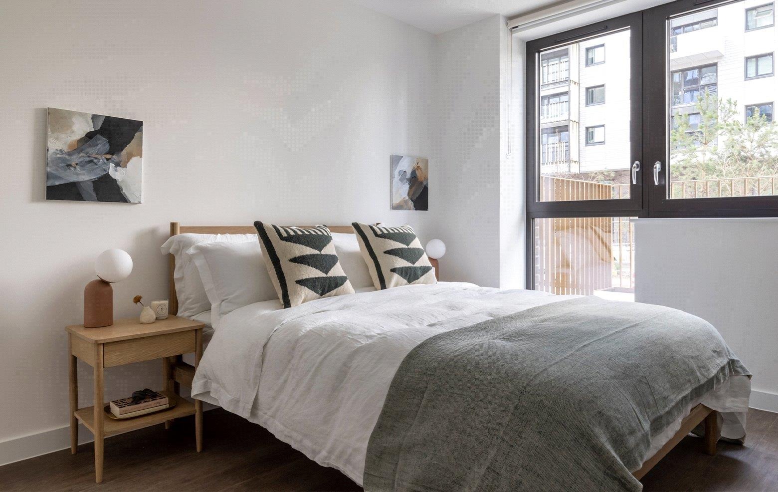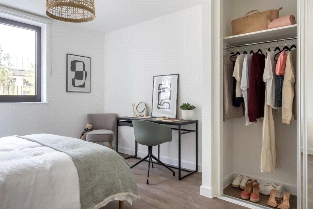 Enjoy a spacious, open plan living area fitted with bespoke furniture packs, wooden flooring with underfloor heating and modern fitted Bosch kitchen appliances. Bedrooms are both stylish and practical, with built in storage throughout and black out blinds to help you unwind after a long day. Bathrooms are equally as sleek, also with fitted storage, rain showers and stylishly tiled floors and walls. Most apartments in the building also benefit from private balconies.